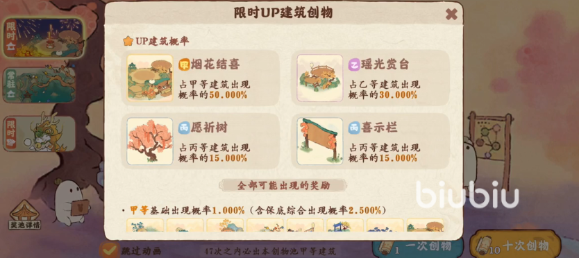 限时的建筑创物池奖励有:甲等建筑物烟花结喜、乙等建筑物
