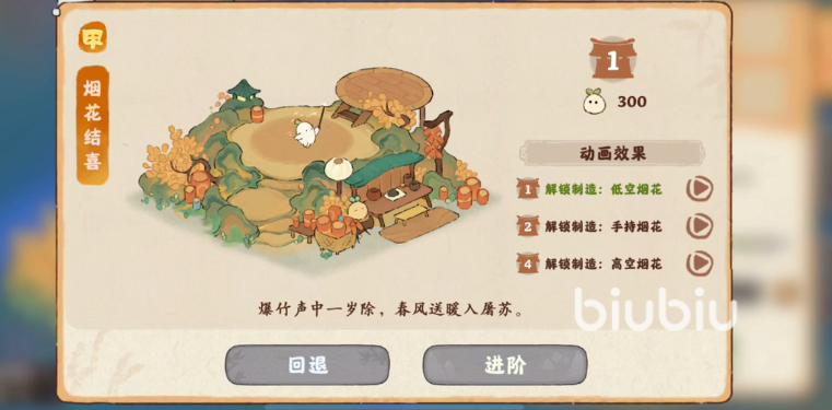 烟花结喜增加舒适度300点,可解锁制作低空烟花、手持烟花、高空烟花三种互动动画效果,同时据官方介绍后期可能会增添自动放烟花的动画优化。