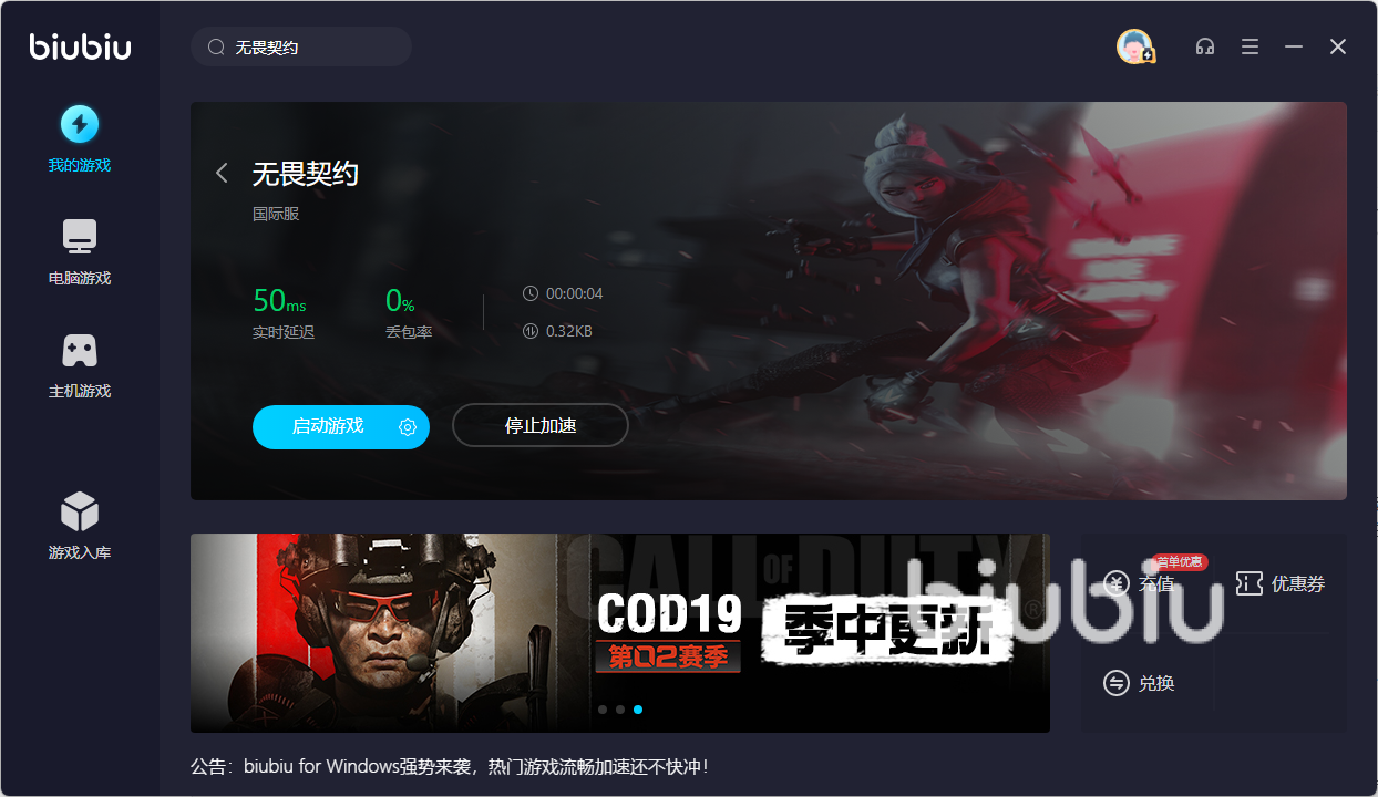 小编在这里衷心为大家推荐biubiu加速器来加速无畏契约。biubiu加速器作为一款操作简单的游戏加速器,首先就是它那简单的操作方法,比起手游版的biubiu加速器,操作还要更加简易哦!各位小伙伴们只需要界面的右上方搜索想要进行网络优化的游戏,比如无畏契约,想要加速的那一款游戏就会出现在我们的游戏库之中哦,如果小伙伴们进行了安装的话,点击加速就可以创造一个完美的无畏契约端游版的完美网络环境了。