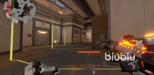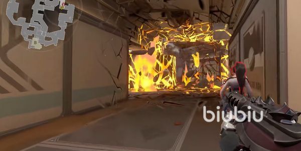 他的大招范围非常的大,大家可以在左上角的地图中看到一个红色的长方形区域,只要在这个区域内的敌人都会受到该技能的伤害,并且该技能也能通过墙,对墙后的敌人造成伤害,还能对敌人造成击飞加震撼的效果,不过唯一的缺点就是使用这个技能的时候,与其他技能一样,需要避开队友,打中队友也是会造成击飞加震撼的效果,就需要和队友沟通好,和他们错开位置再使用。