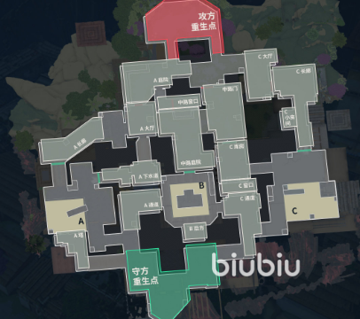 在这一个地图当中为大家提供了三条不同的道路,在每一个道路上都有很多独特之处,可以防御,可以攻打。游戏中包点数量一共有三个,机制为可破坏门。