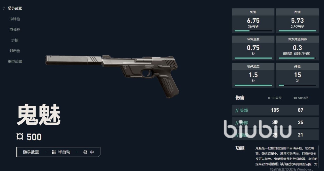 鬼魅武器在商店的售价比较便宜,大概玩几天就可以获得,在武器类型上属于手枪,使用手感不错,单次的伤害比较高,不过弹夹容量很低,如果长时间作战是比较容易空子弹的。