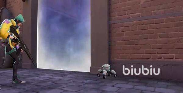 然后是Q技能自动哨兵,按下Q后进入到部署阶段,哨兵同样也是能够隐形的,可以自动追踪进入范围内的敌人并且跳起一定高度后爆炸给敌方造成易伤效果,在易伤效果生效的期间内攻击到敌人可以造成双倍伤害。但是这里要注意一下,哨兵只有获取到敌方视野才能够出发警报,如果敌人是隔着墙,距离再近也无法触发,游戏中这样依靠视野来触发的条件有很多,大家要习惯。这个自动哨兵是可以检测到一些进入隐形状态的敌人的,比如芮娜,所以适用性比较广。这个哨兵有着生效范围,玩家超过范围后会失效,重新回到范围内就能够激活,或者进行远距离回收,长按Q键就可以完成操作。