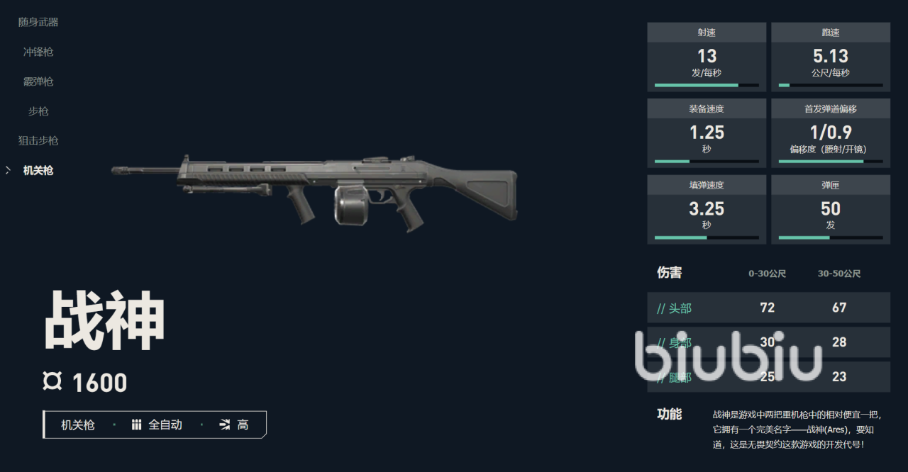 战神价格1600,游戏内俗称战神狗,大枪被战神缴掉的时候,血压会比一般的高,备弹50发,开镜不降低射速,并且降低后座,比较推荐的皮肤是奇点。