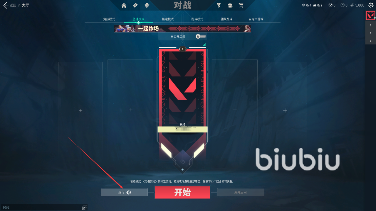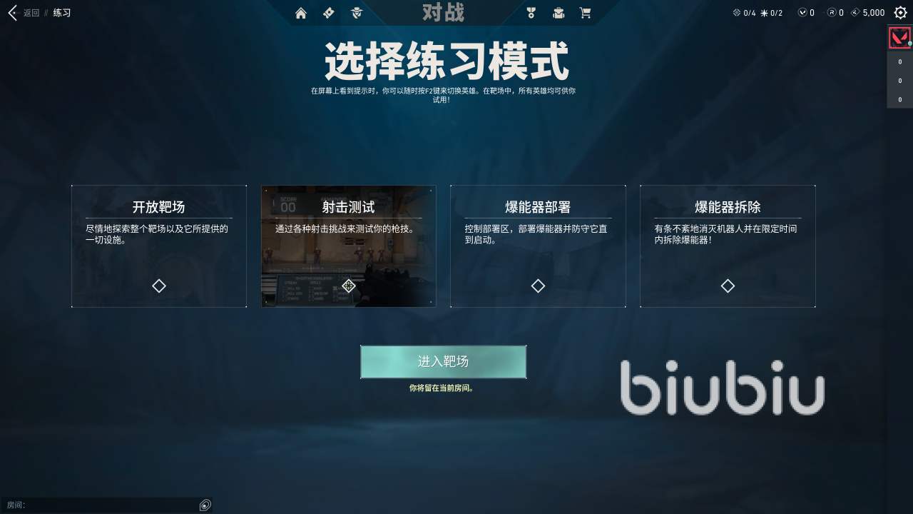 进入游戏大厅之后点击对战,可以在开始红色按钮旁边看到有一个瞄准的练习,点进之后就可以看到开放靶场、射击测试和爆能器的部署与拆除,最后一个爆能器就相当于c4,玩过CS的玩家基本上就不用去学习,前两个则是可以让大家尽情的探索,并且完成射击挑战等等,大幅度的短时间内提高竞技瞄准度。