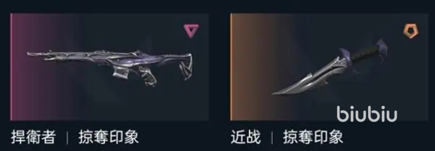 掠夺印象1.0(紫色品质)是一套套装,包含左轮(T1)、捍卫者、暴徒(T0)、大狙(T1)和反手刀。这套装具备无人能够拒绝的原力换弹功能,外观优雅,手感极致,特效低调却充满内涵,音效如同丧钟般沉稳,可逐步终结敌人。这是小编个人最喜欢的套装,总之,毫无疑问地推荐购买。