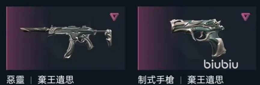 弃王遗思(紫色品质)是一个套装,包括小手枪(T1)、恶灵、暴徒(T1)、大狙(T0)以及反手刀。这套装的最大亮点在于它有两种不同的开火特效、音效和击杀特效。作为一套紫色品质的套装,它真正具有高性价比,非常值得推荐购买。