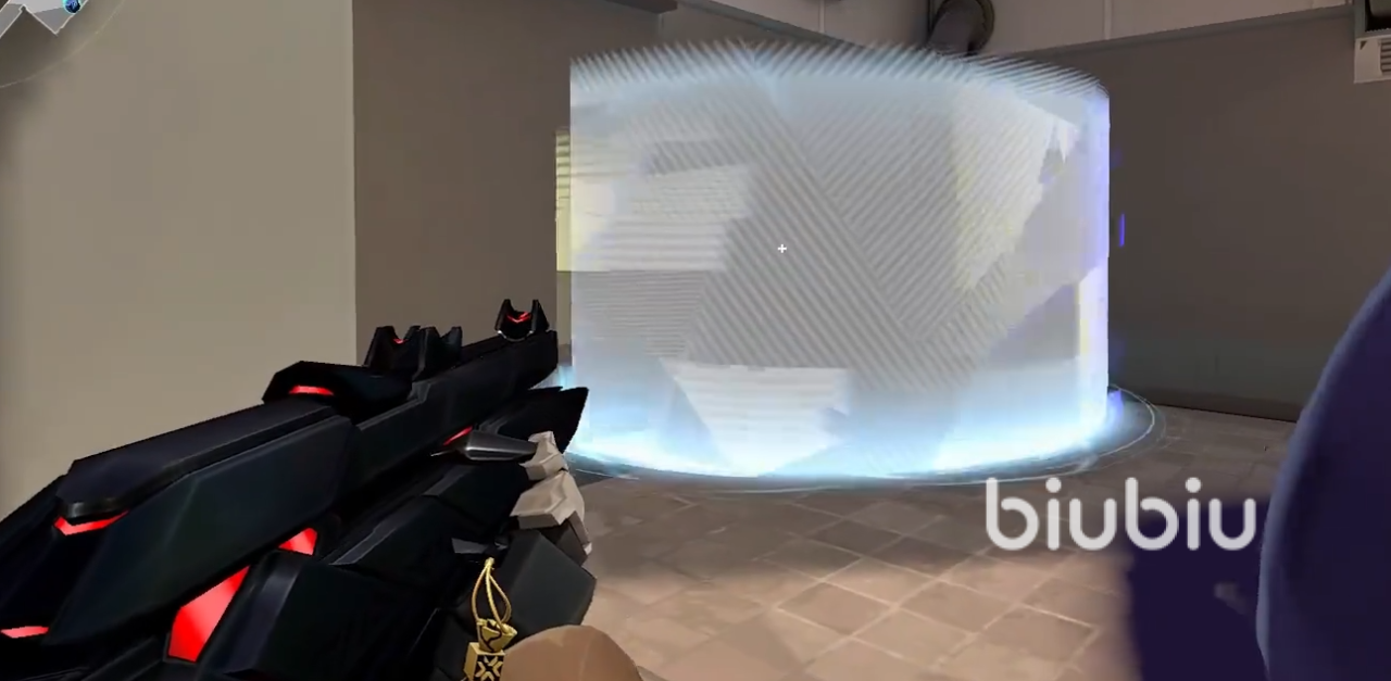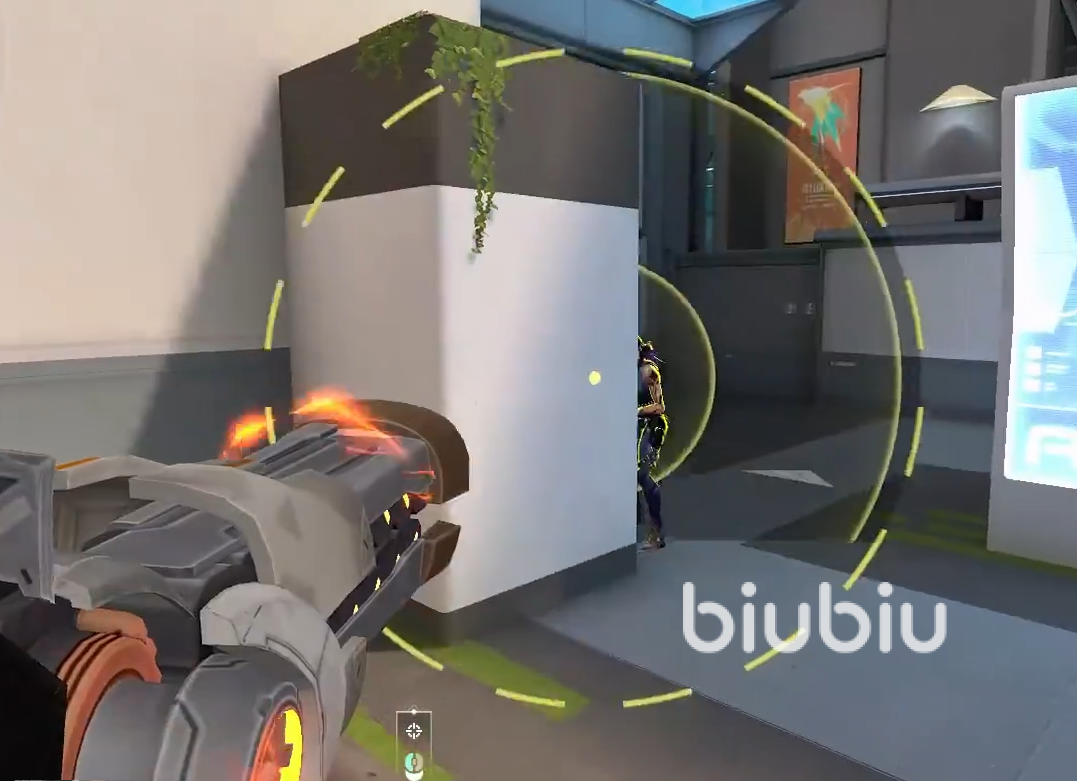 之后是他的二技能闪光弹,这个技能是同样需要配合决斗位的英雄打才行,该技能在释放之后他可以利用手中的机械臂射出一枚闪光弹,这枚闪光弹会粘在墙上或者地板上然后一秒后爆炸,之后看到闪光弹的敌人就会陷入失明状态,可能这个时候有的玩家就要问了,明明都闪到了让敌人失明了为什么还不能自己去打?这是因为铁臂的这个闪光弹是全游戏闪光弹中延迟最高的,别的英雄的闪光技能都是扔出去马上引爆,而他的这个闪光需要1秒之后再引爆。