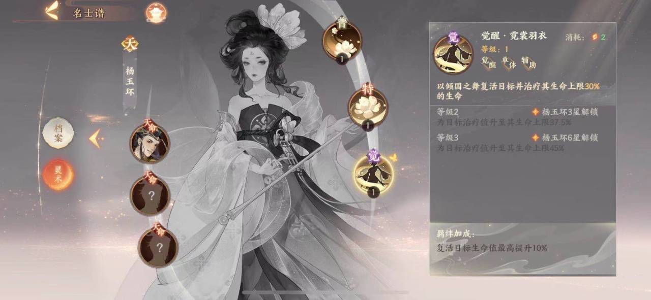 特效技能为群体治疗,可以最高为3名友方目标恢复杨玉环生命上限24%的血量。值得一提的是,杨玉环的觉醒技能还带有复活功能,可以复活已经退场的友方角色,并且最高可为其恢复自身生命上限55%的血量,无论从哪个角度看,杨玉环绝对是最强奶妈,不过作为一张天卡,杨玉环却也是非常难养成的。