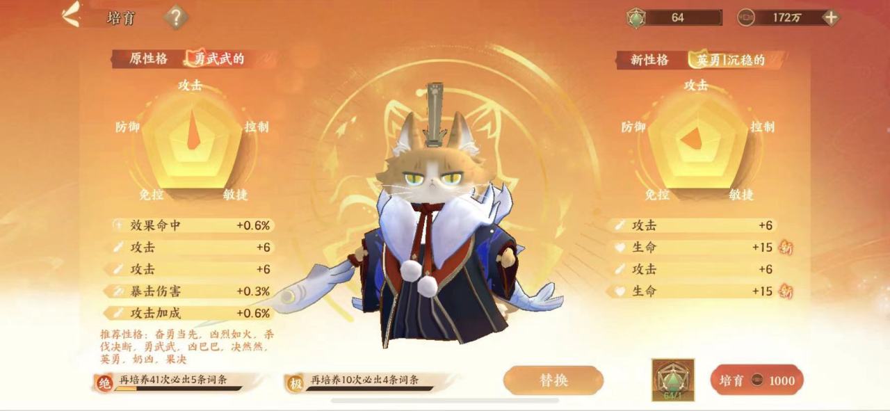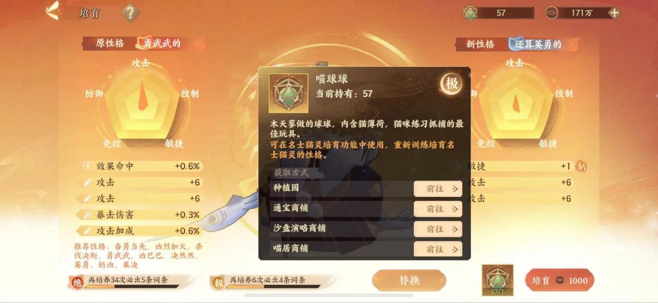 每次培育都需要消耗一个喵喵球,喵喵球可以在种植园、通宝商铺或者活动中获取,洗词条的时候,由于始皇喵属于攻击加成猫咪,因此它的推荐性格为奋勇当前、凶烈如火以及杀伐决等,其中最好的词条就是出现五词条。五个词条属性最好围绕着攻击、暴击以及敏捷展开,遇到合适的点击替换就可以了。