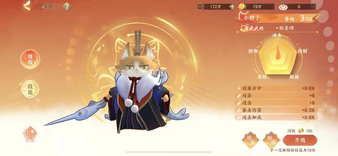 其中品质最高的就是那些名士喵,所谓名士喵就是在玩家结识了某位名士之后,在猫舍内玩家就可随意挑选一只猫将其进化为对应的名士猫,例如选择了嬴政,猫咪进化之后就变成了始皇喵。进化成功之后,猫咪的整体实力技能都得将得到一个质的飞跃,而且玩家还可通过培育的方式给这个名士喵增加一定的属性。