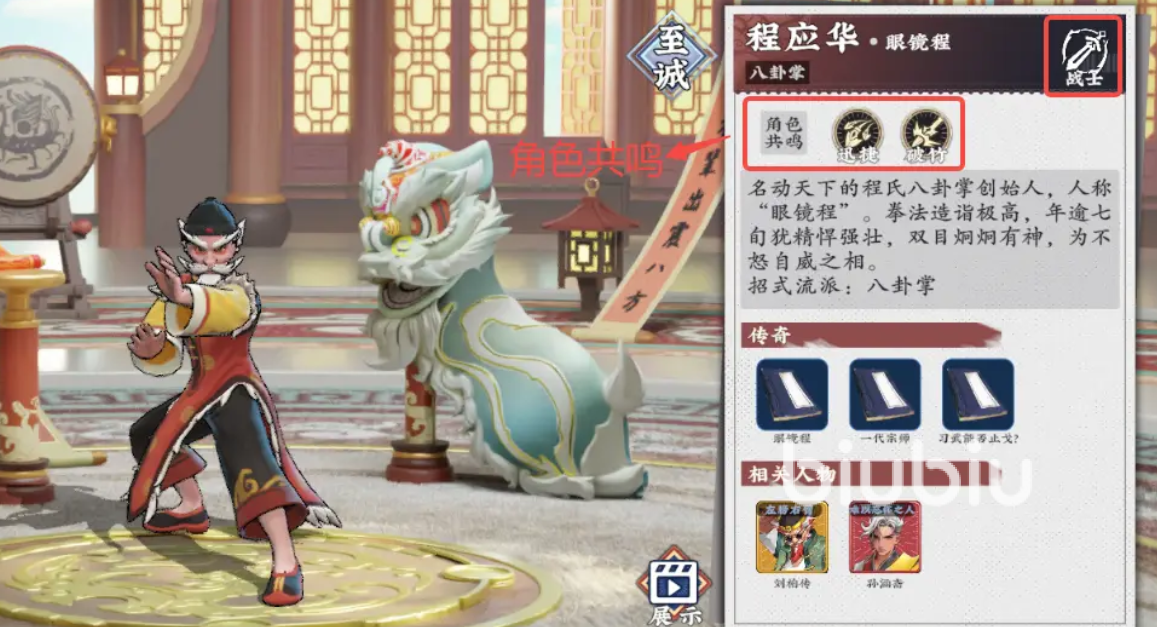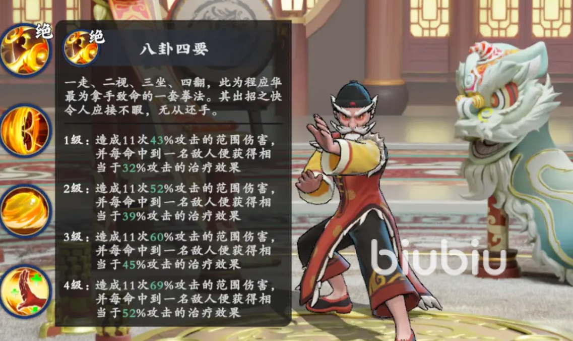 程应华是一个战士角色,作为名动天下的程式八卦掌创始人,有着极高的拳法造诣,年过七旬依然精悍强壮,双目炯炯有神,他兼具了破竹和迅捷两种羁绊,迅捷能附加额外的攻击速度,破竹可以附带攻击力百分比的真实伤害;