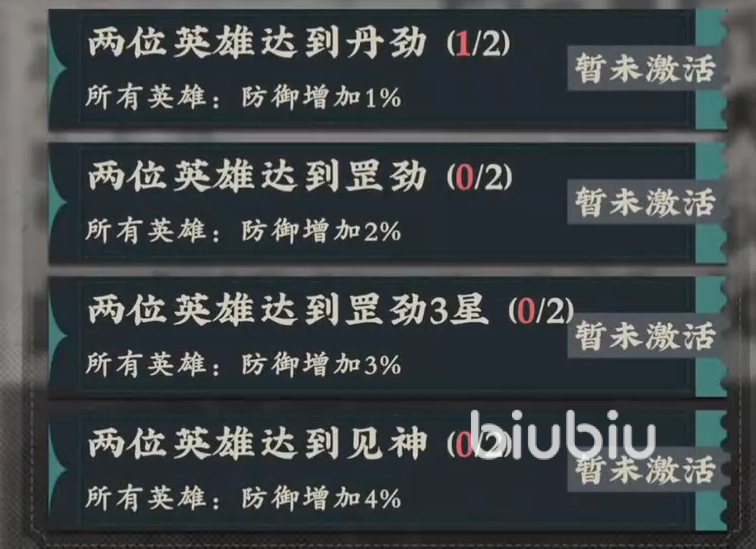 这时可以 随意点击一个进去看看,例如风云之余。只要这里面的同道角色,同时达到丹劲境界的话,那就可以额外增加1%的防御,生存能力大大增强。还有他们并不要同时上场,只要任意一个出现在战场中,均能得到属性加成!若是继续提升等级到罡劲的话,那就能继续提升防御值。