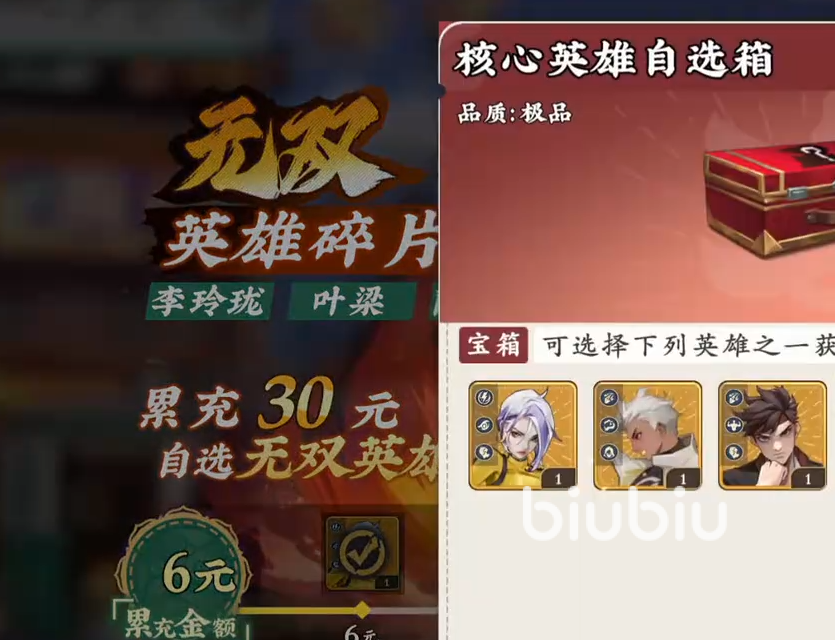 然后第二档的充值金额要求是30元,可以从三个奖励之中选择一个。第一个是核心宝箱自选箱,可以从三个角色里选一个。这里更建议为李玲珑升阶,就可以获得更强的属性值加成,并获得更多特殊效果。若是更喜欢叶梁或者陈振卿的话,也可以选他们作为主要的培养对象!值得一提的是,6元能与30元叠加,也就是说,继续充24元,即可达成第二个档位!
