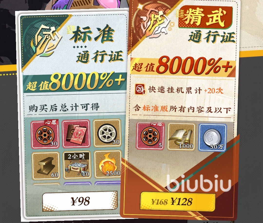 随机宗师英雄卡:标准版98元,高级版128元。标准版总计可获得 30个【心愿胶片盘】、30个【普通胶片盘】及【随机宗师英雄自选卡】等丰厚资源。高级版购买后,除可获得标准版全部奖励外,还能额外领取 5个【心愿胶片盘】、1000张【心得】及 50万【银元】,还可解锁【快速挂机累计+20次】特权,所以建议直接买128元高级版,性价比更高。