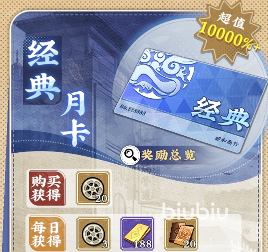 经典月卡:30元,购买立得20【普通胶片盘】(可抽普池),买后每日能获得3【普通胶片盘】、188【金砖】和20【英杰自选碎片】(集齐100合成英杰),可解锁百抽宗师招募特权,共计能获得110【普通胶片盘】、5640【金砖】、600【英杰自选碎片】。