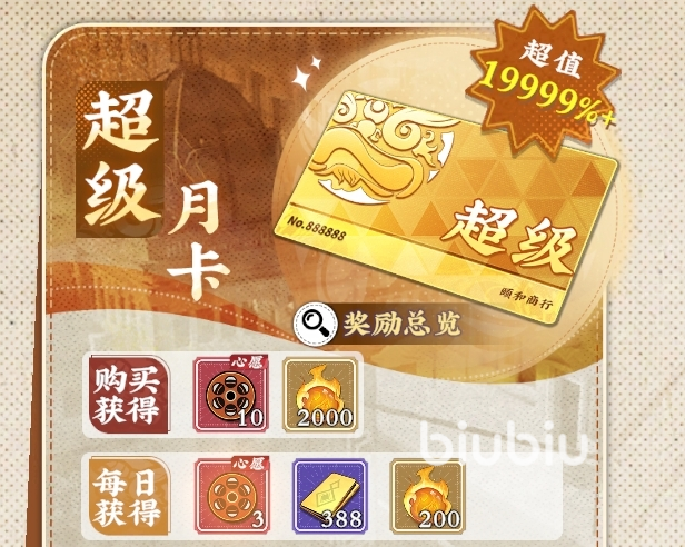 超级月卡:68元,购买立得10【心愿胶片盘】(可抽心愿池),买后每日能获得3【心愿胶片盘】、388【金砖】和200【武魂】(升阶材料),能解锁【每日金砖挂机次数+1】和【武道会助威奖励自动领取】特权,共计能获得100【心愿胶片盘】、11640【金砖】和8000【武魂】。