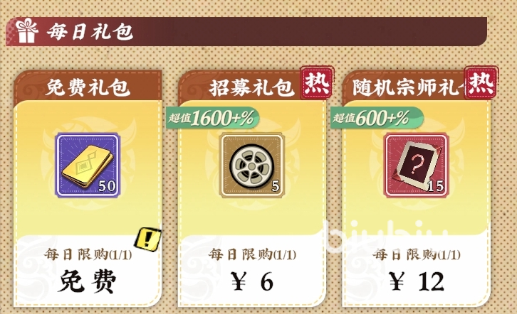 每日礼包购买优先级:6元【招募礼包】>12元【随机宗师礼包】>30元【心愿礼包】=30元【丹药礼包】>其他礼包。