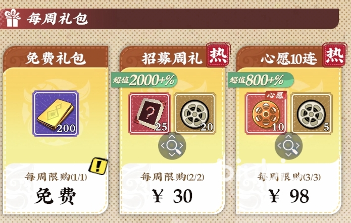 每周礼包购买优先级:30元【招募周礼】>98元【心愿十连礼包】>98元【功法周礼】=98元【丹药周礼】>其他礼包。