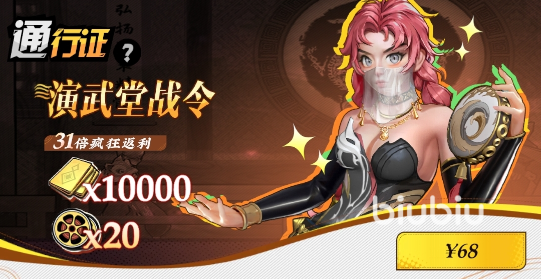 演武堂战令:68元,参与演武堂爬塔能获得10000【金砖】、20【心愿胶片盘】,性价比不错。