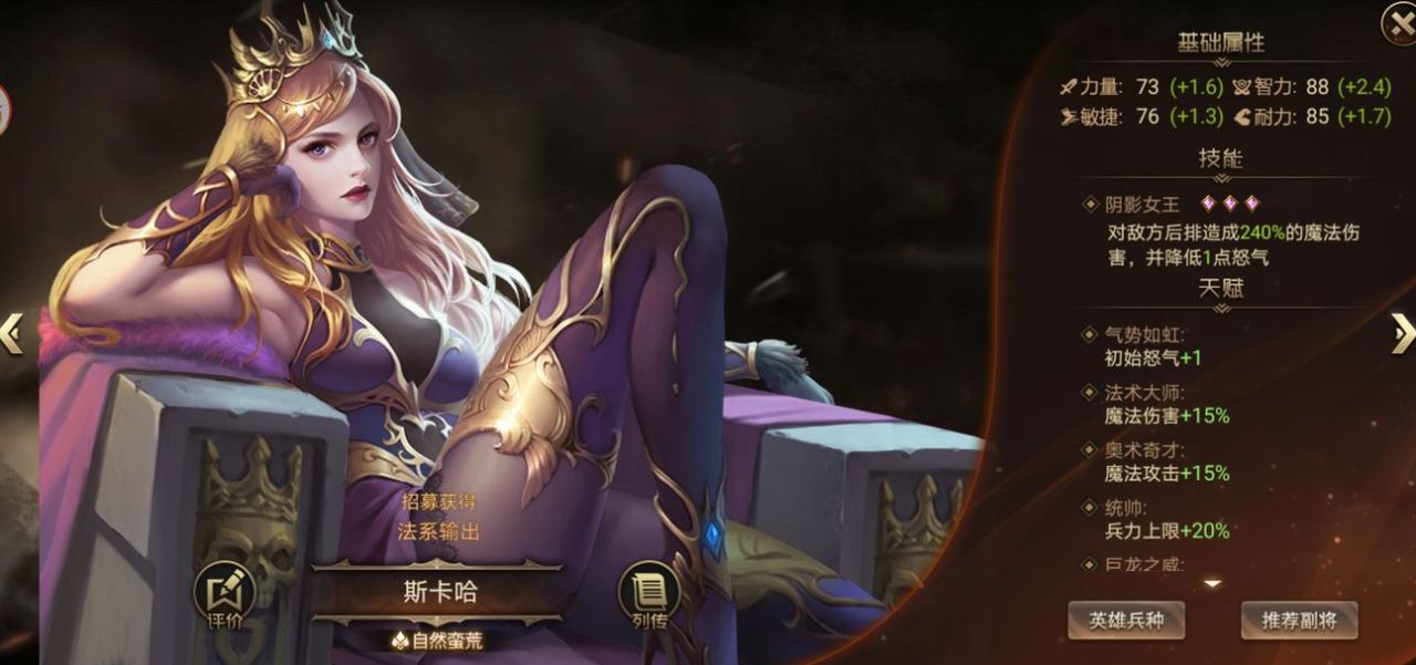 1、必带英雄:斯卡哈是亚历山大阵容必带的英雄,毕竟斯卡哈、亚历山大同时上阵方伤害+10%,这一点是不能忽略的。