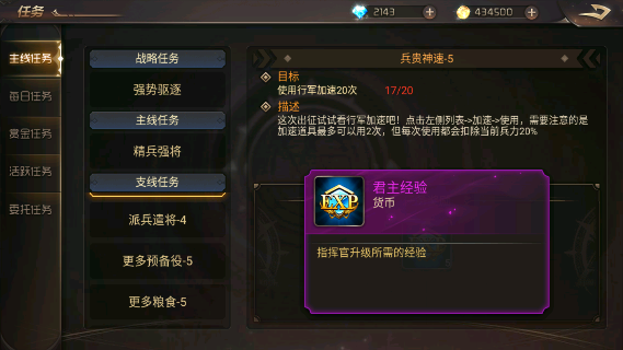 (2)任务升级:其实游戏前期通过完成任务,来达到快速升级的目的。可以获得经验值的任务分为主线任务、战略任务、支线任务,可以先去任务详情中确认完成所需要的条件,这样完成起来会更简单一些。