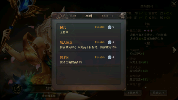 2、部分角色会有两种特殊兵种供大家选择,选择起来也不难,主要是看当前英雄的定位。比如使前排单位,那么可以增加生存的兵种效果就会更高。后排的输出英雄,那么兵种选择提升伤害的就好。