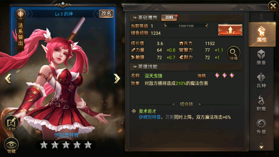 4、伊姆贺特普:前期可以培养,但后期只能做副将。该英雄是输出,攻击高防御低,应该站在后排。推荐使用刺客兵种。
