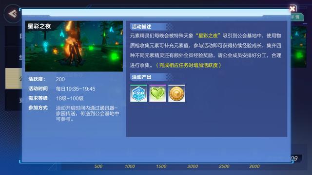 星彩之夜:级别限定18级至100级。在每晚的19:35-19:45,玩家可以经过家园传递来到公会基地这里参与星彩之夜。在星彩之夜中,玩家可以连续获得经验值,还能够经过捕获小精灵获取10倍的经验值。在此时期,也能够为自身的枪械填补元素。