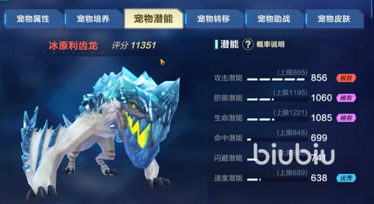 那么,首先要给大家带来的便是冰属性中的佼佼者冰原利齿龙,从基础属性方面来看,攻击潜能方面,在所有宠物中算是第一梯队,有着极高的攻击潜能,意味着该宠物有着相当不错的输出能力以及伤害,由于是冰属性,在特定局势中有着更为良好的属性契合发挥,而且该宠物有一点非常奇怪,感觉比其他同级别的更容易获得,基本上很多玩家都会人手一只。