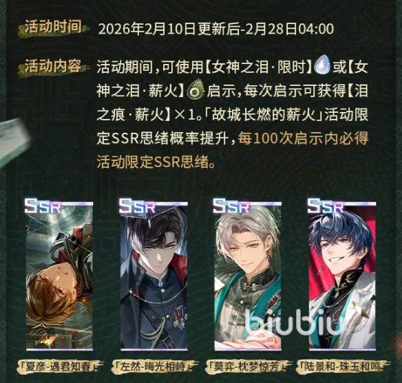 咱们首先来介绍卡池。本次的卡池是配套活动故城长燃的薪火来的。这次的新春卡池从目前放出的情报来看,是属于四人的大活动卡池。这里需要注意,这个卡池是一个单独的卡池。这也就意味着它不会继承之前任何一个卡池的抽数。但这次有点比较好的是,本次的新春卡池分成了4个单人的卡池,咱们本身需要抽哪个男主角的话,那么就去抽取哪个卡池。如果是混池的话,那么咱们想要抽取的话则真的很看运气,这也是目前卡池玩家们称赞比较多的点。