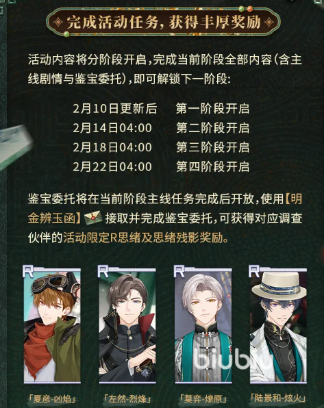 这次的活动总共分为4个阶段,从2月10日更新之后开启第一个阶段。到了2月22日则是开启第4个阶段。每一个阶段都会有着不同的活动和主线剧情开启。同时鉴宝委托也是分阶段开放的,它会在当前阶段的主线任务完成之后开放,咱们需要使用明金辨玉函来接取完成鉴宝的委托。