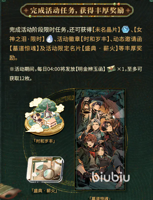 在活动开启期间或出现限时的任务。咱们在完成这些任务的时候可以获取到各种的奖励,这些奖励包括未名晶片,限时的蓝色女神之泪,活动徽章时和岁丰和动态邀请函以及活动的限定名片。这些奖励从目前来看还是很丰厚的。