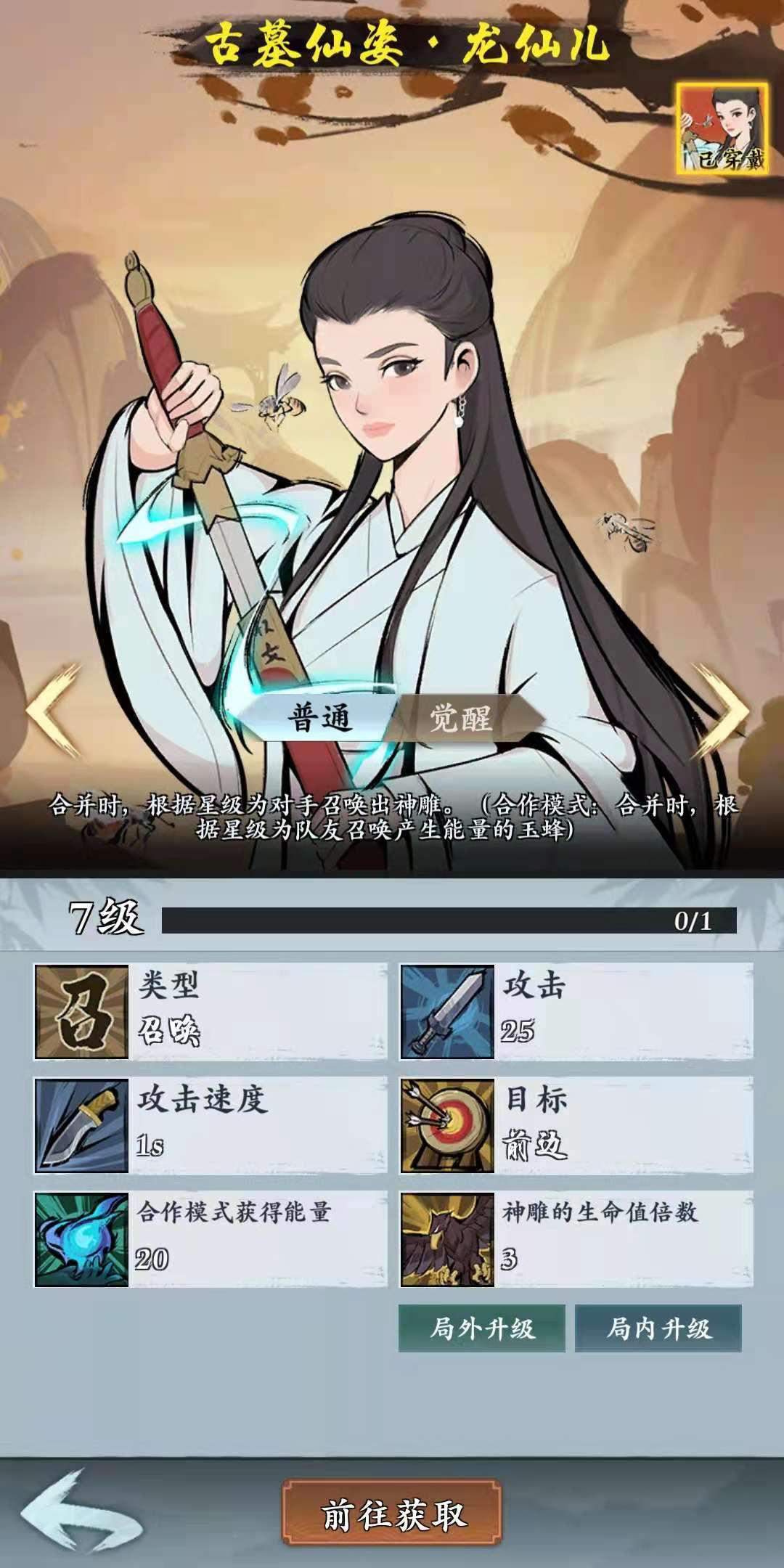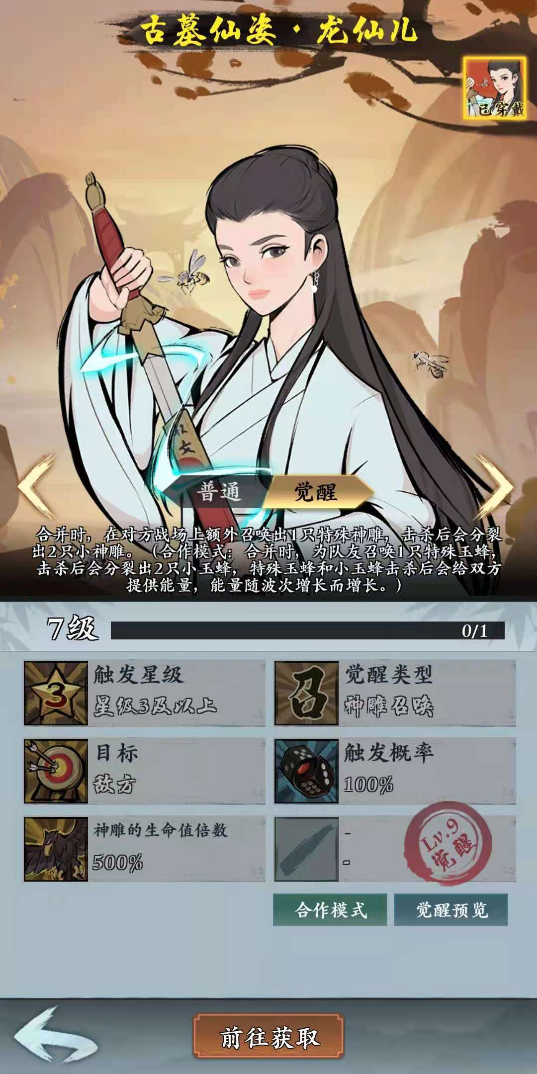 觉醒功能只有传说级别的英雄可以使用,在后期觉醒是很有必要的,龙女的玩家在培养的过程中,可以优先觉醒龙女。觉醒后,龙女在合作模式中可以召唤出一只特殊的神雕,并且在击杀后获得两只小神雕,除此之外,神雕的生命倍数也会得到500%的提升。