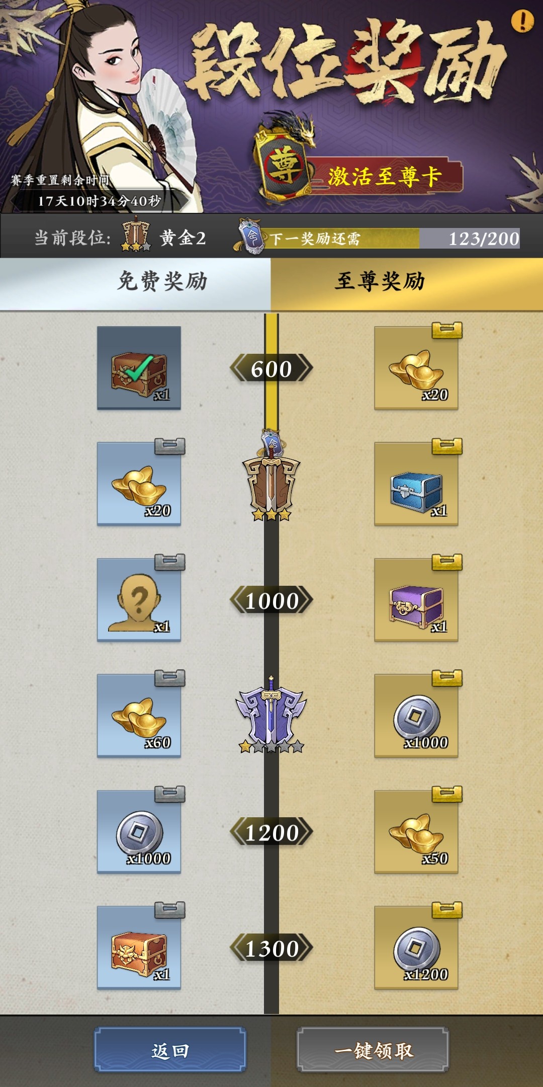 玩家的胜场越多得到的积分就越高,在战斗页面的左上角处点击段位查看,该页面除了显示玩家的段位之外,还有不同阶段可以得到的奖励预览。当玩家的段位提高,得到的奖励等级也就越高,如果想让资源提升一个层次,可以开启旁边的至尊奖励,只是需要氪金。