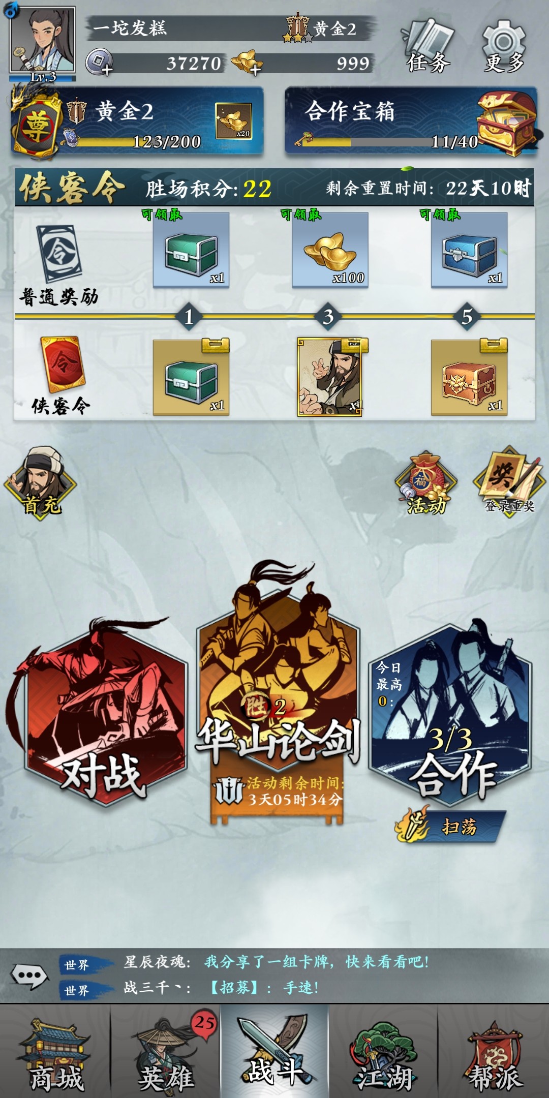 侠客令可以在战斗界面的上方查看,玩家每次参加竞技对战获胜后会得到一定的积分,在侠客令处可以直观的看见积分有多少。积分的高低决定玩家能够开启什样的宝箱,在侠客令这里,宝箱里有不同等级的资源,玩家只需要累积积分,就能获取资源啦。