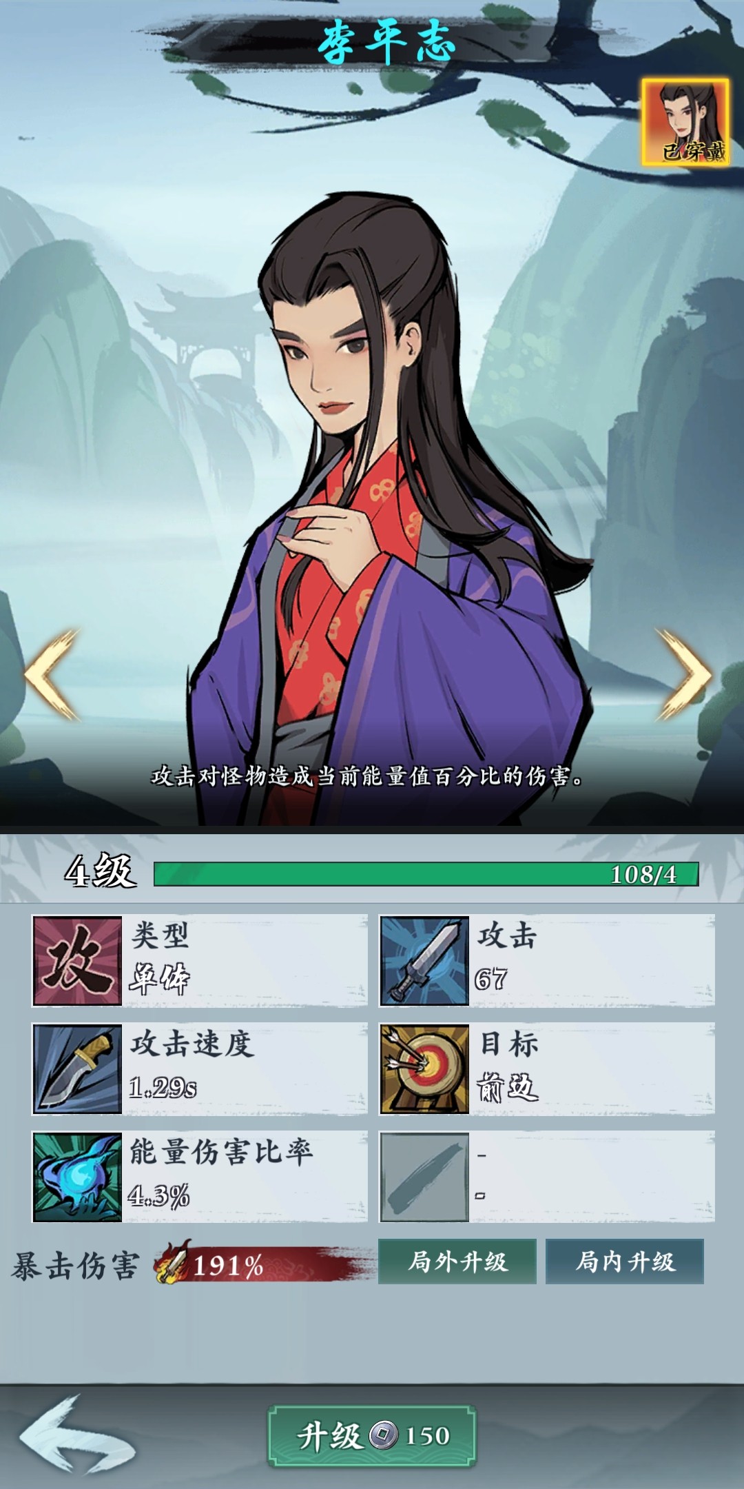 由于等级不高,李平志的获得方法有很多,而给英雄升级的方法就是消耗同样的英雄数量,这对于李平志来说是一个很好的机会。初始等级三级,局外的每次升级都可以使其提升7的攻击值,但同时他的攻击速度也会降低0.01。