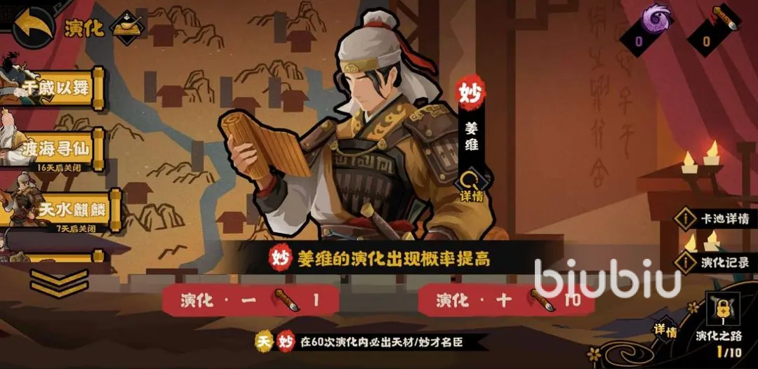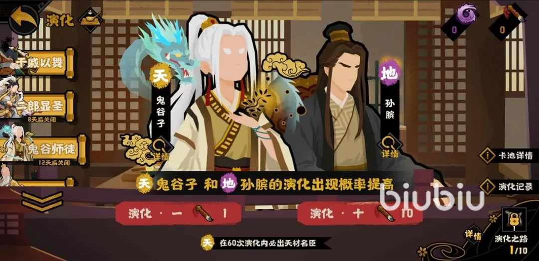 ”名臣演化限时提升”活动,在5.30-6.6内,妙才名臣·姜维演化概率限时提高;6.6-6.19期间,天材名臣·鬼谷子,还有地贤名臣·孙膑的限时抽取概率提高;6.7-6.15期间,天材名臣·杨戬的UP概率提升;这些都是不可多得的角色抽取概率UP池,建议小伙伴们按需去抽取。