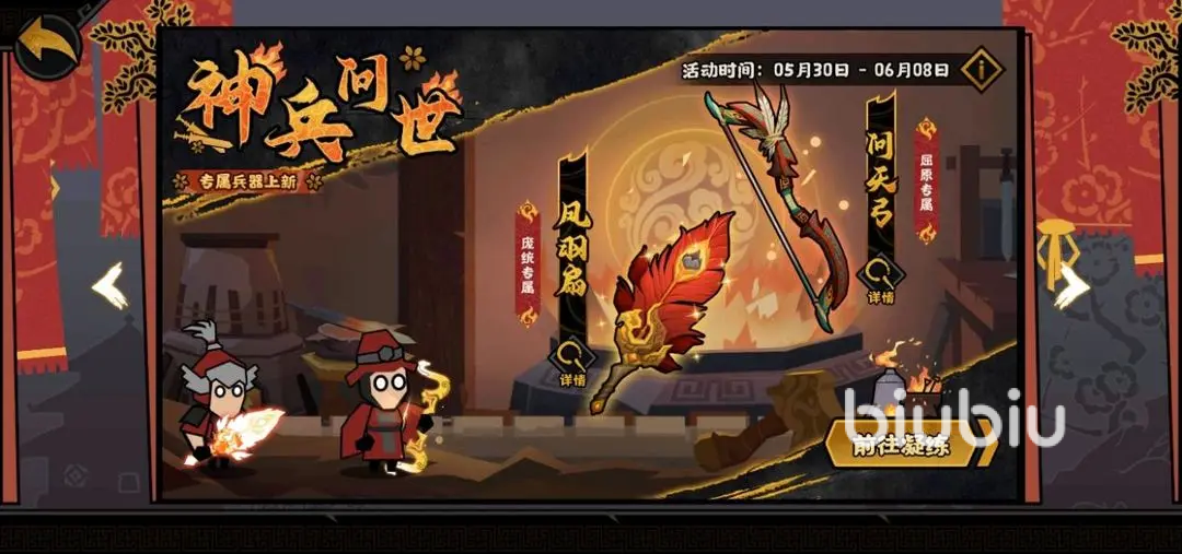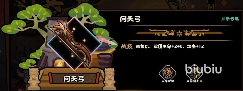 首先是在5月30日,即将上线屈原的专属兵器“问天弓”,以及庞统的专属兵器“凤羽扇”,问天弓佩戴后队伍生命加240,攻击加12;“天命反侧”的招式让厨师远程队友攻击力加20%,剩1队友时效果翻倍;“来吾道夫先路”使用后,在开战时,佩戴者贯穿正对敌军,敌军会损失300生命值,命中则让自己的射程提高200%。