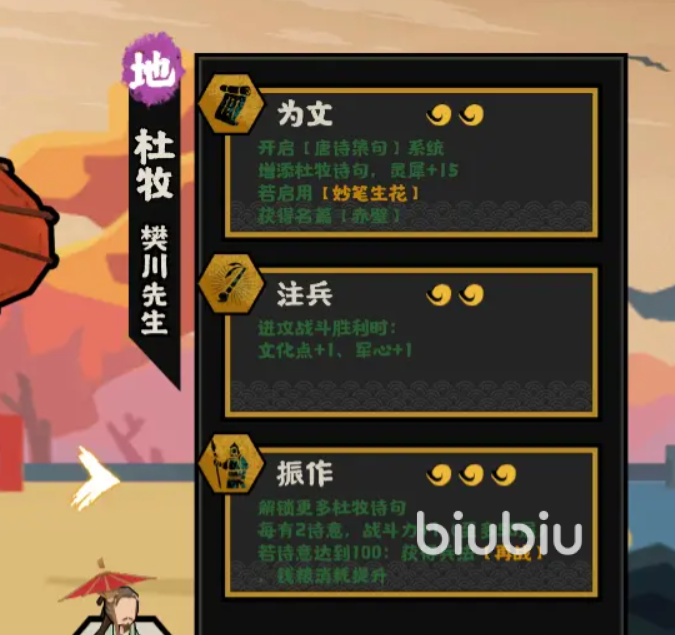 第二个能力是为文,将开启唐诗集句的系统。在我们让李牧做诗的时候灵犀将会增加15点。第二个则是注兵,进攻战斗胜利的话,则是会获取到文化点+1,军心+1。