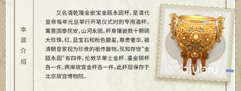 金瓯永固杯是游戏中的高品质人物,职业属于轻锐,隶属于资料部。其外形华丽,喜欢金色的衣着,原身为清朝宫廷的器皿。该角色的综合评级可达到T0。
