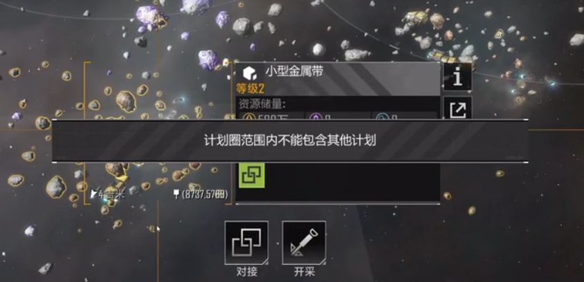 在地图中选中玩家想要对接的目标,点击两个方形组合的绿色按钮,就会显示这个对接点具体的对接信息,包括产量、大小,以及对接后获得哪种效果,对接效果包括提升金属产量、获得蓝图等等。