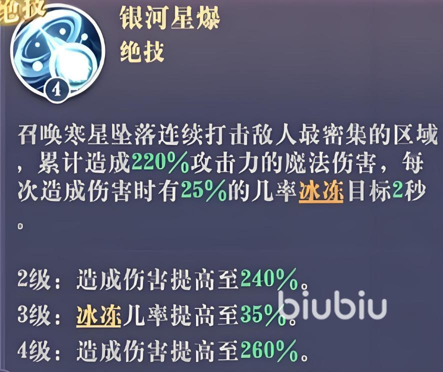 先直接来看她的大招,是核心输出技,最高260%的倍率,并且是群伤,同时有35%的几率降低人冰冻,既有输出也有控制,可能你会觉得这概率有点低,但要考虑到它是群体技。然后主动技可以给自己套盾,并且获得减伤。