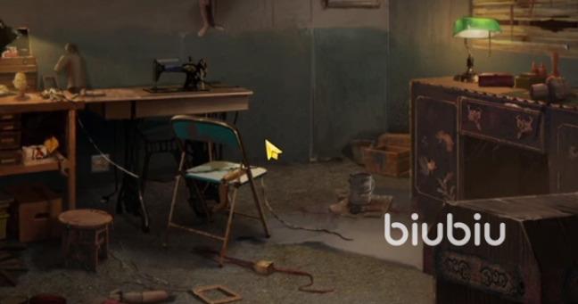 然后我们先将摆件给组合起来,之后将组合好的摆件放到柜子前面,可以得到鞭子。根据提示的图案控制剪影,便可以让缝纫机通电。然后把摇把放入戏盒子中,之后会有个小游戏,做完后便能拿到面具。然后将磨刀石以及鞭子放在盘子上,面具则是放到脸上,便可以获得银针。