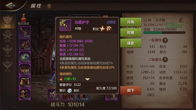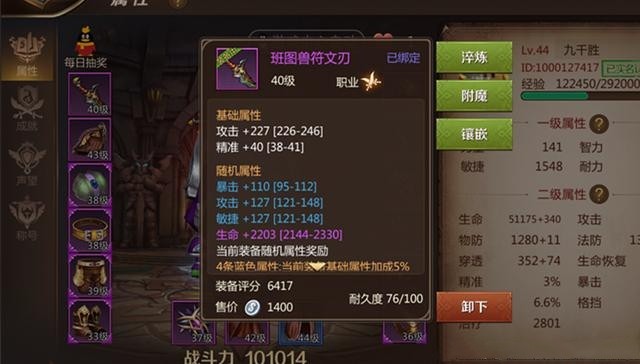 快速提高战力紫色装备的穿戴和属性的淬炼会是很好的选择。由于每一件紫色装备鉴定以后进行穿戴就可以立刻为游戏玩家带来很多的属性提高,如刺客40级紫色武器“班图兽符文刃”,鉴定穿戴以后,就可以直接提高游戏玩家的227点攻击力(226-246)和40点精准(38-41)。