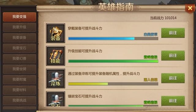 战力提高的办法有许多,有装备、技能、淬炼、宝石、附魔、幻兽这些都是可以提高游戏玩家战力的办法之一。游戏玩家打开游戏左下方的英雄指南,并点一下我要变强,就可以能看到这些了。