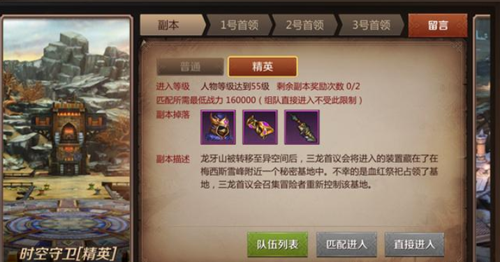 副本“时空守卫”在游戏玩家级别到达55级时启动。副本分为平常难度和精英难度2种。此中系统发动游戏玩家战斗力到达160000再去挑战精英难度。然而这儿系统发动的战斗力仅仅是起码要求,游戏玩家在刚到达这一个战斗力时还在挑战,还是很辛劳的,因而发动游戏玩家战斗力到达190000再去挑战。副本中共有三个boos具体是一号boos尖兵坦克、2号boos驭枪使德兰侬、三号boos战王。游戏玩家要想通过关卡副本,就一定要击倒这三个boos。