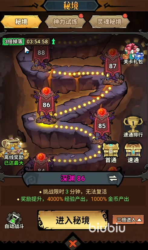 秘境的参与也是非常的重要的,挑战秘境不但能收获超级多的奖励,还能享受三倍掉落的时间,对于许多玩家来说都是非常的超值的存在,并且挑战的越多离线的奖励也就越多,尽量要凭借自己的实力多推关卡这样就能保证各位玩家获取到属于自己的奖励内容。