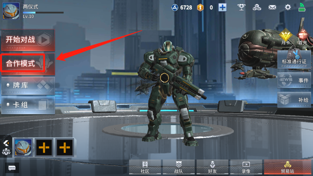 (2)更换卡组:进入游戏的主页面,点击左边的“合作模式”,然后继续点击屏幕左边的“装备”,这里是游戏的装备区域,是更改指挥官各种设置的地方。
