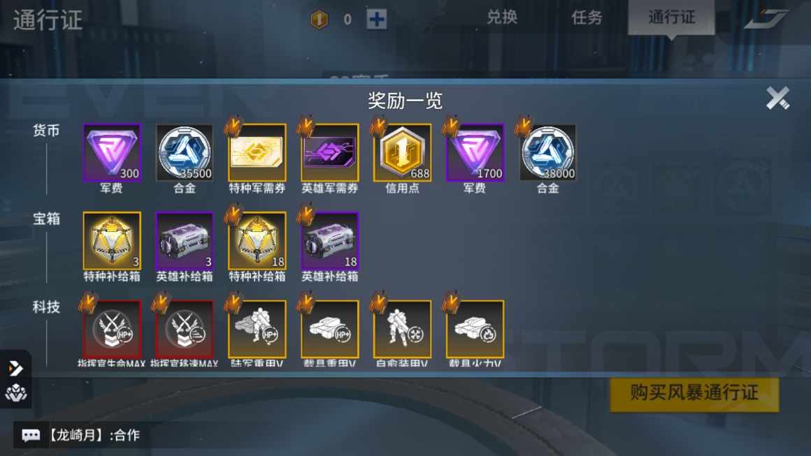 2、风暴通行证冲刺包:额外38000合金与1700军费、额外18个英雄补给箱、额外18个特种补给箱、总计156个幻形芯片、解锁风暴通行证专属任务、信用点返还总计688。并且通行证等级直接增加30级。